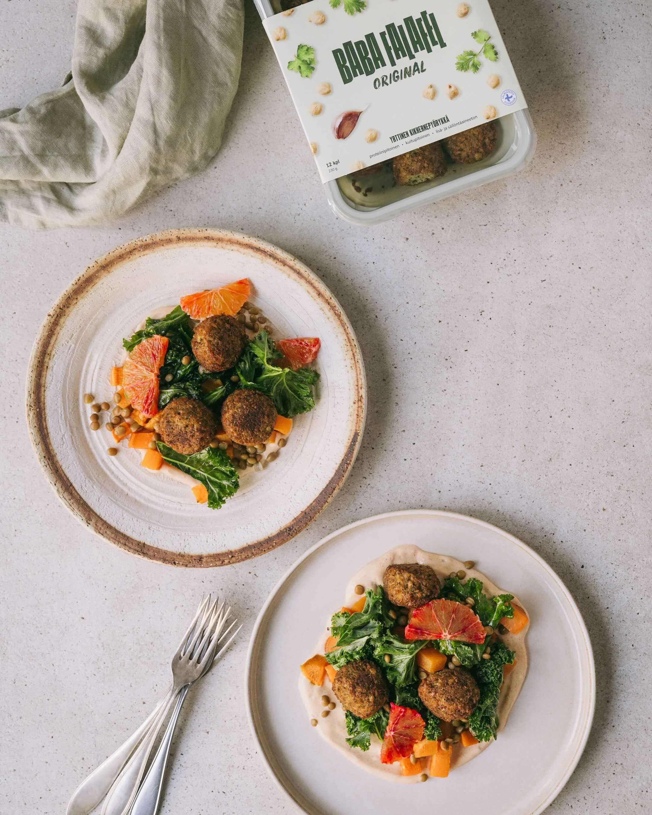 Oon aika tarkka siitä, mitä lautaselle laitan. Valmistuotteissakaan en halua tinkiä ainesosaluettelon yksinkertaisuudesta saatika mausta. Baban falafelit on ainoat valmisfalafelit, jotka kelpuutan maun ja ainesosaluettelon puolesta. Baban Original Falafelit on gluteenittomia ja vegaanisia: