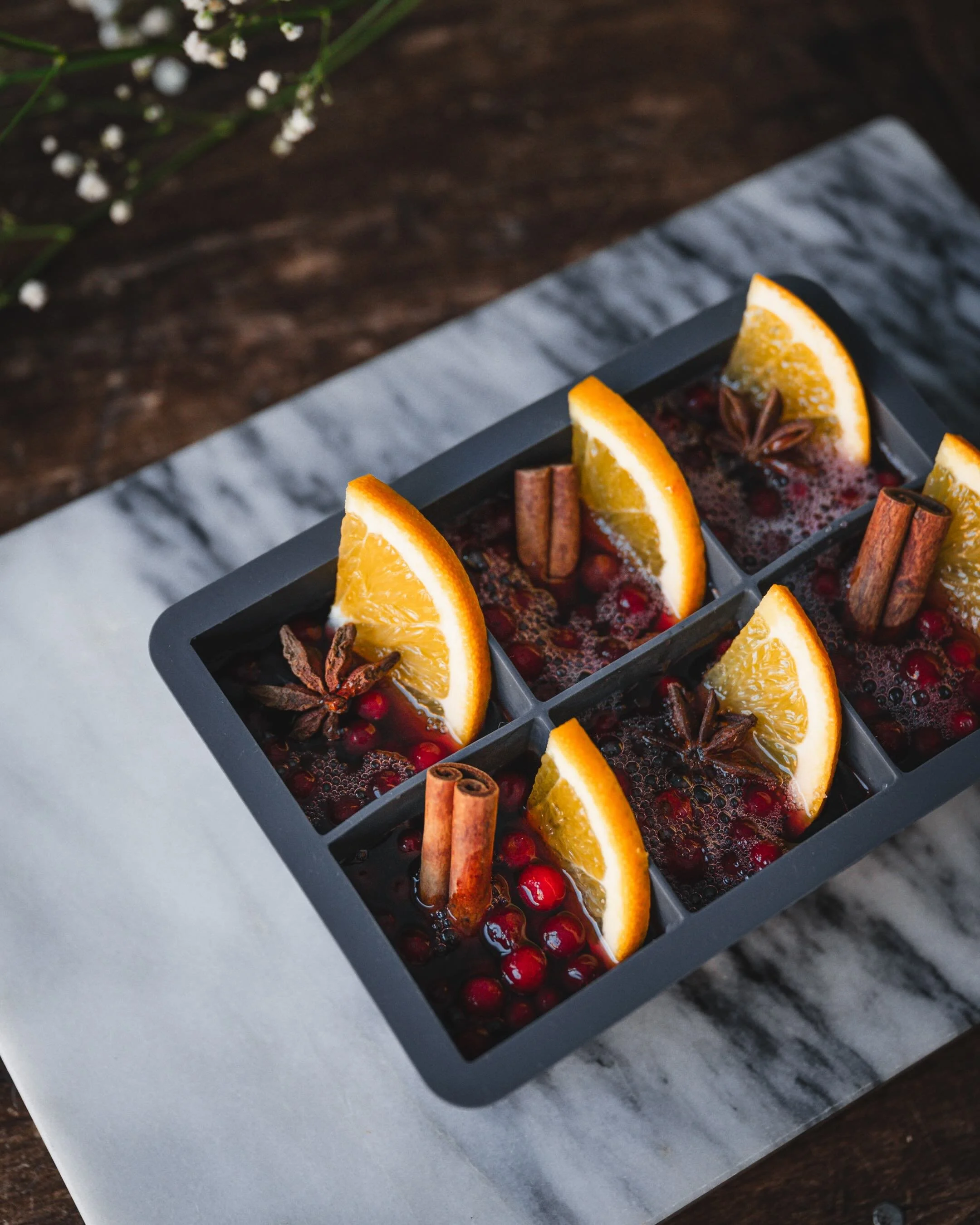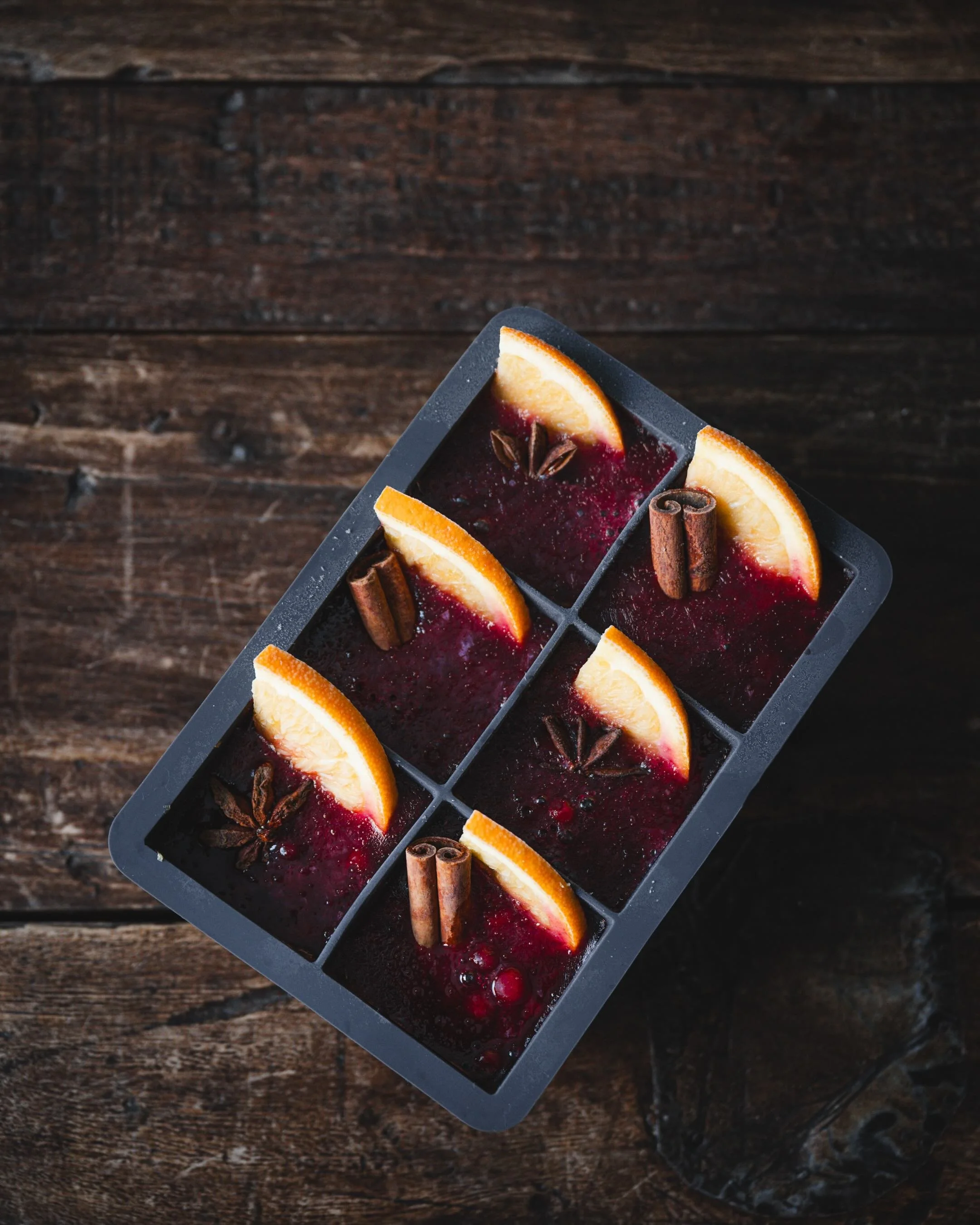 Valmista glögijääpalat edellisenä päivänä. Nostele muottiin appelsiinisiivu, puolukoita, kanelitanko ja/tai tähtianis ja kaada perään glögiä. Pakasta.