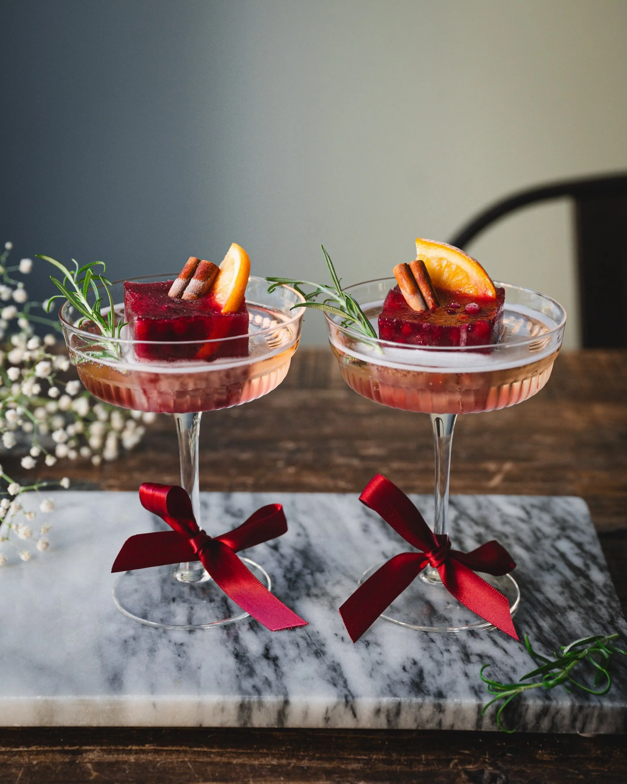 Kokoa drinkki asettamalla samppanjalasin pohjalle glögijääpala, kaatamalla mukaan kuohuvaa ja viimeistele rosmariinin oksalla.