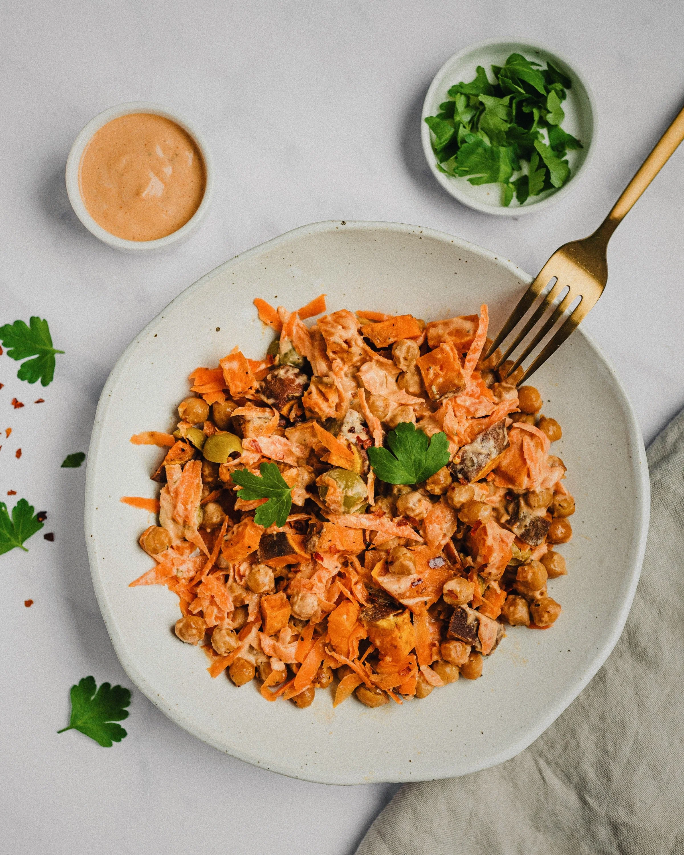 Harissa-salaatti paahdetuilla kikherneillä ja bataatilla