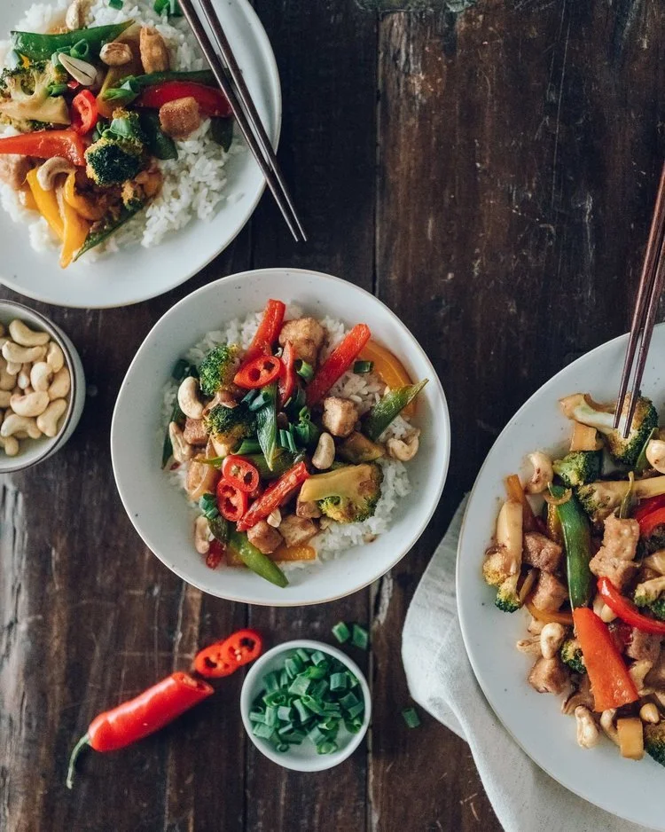 Sekoita kastikeainekset pienessä kulhossa ja kaada kasvisten päälle sekoittaen samaan aikaan. Tarjoile riisin tai nuudelin kera. Viimeistele annokset kevätsipulilla, punaisella chilillä ja cashewpähkinöillä.