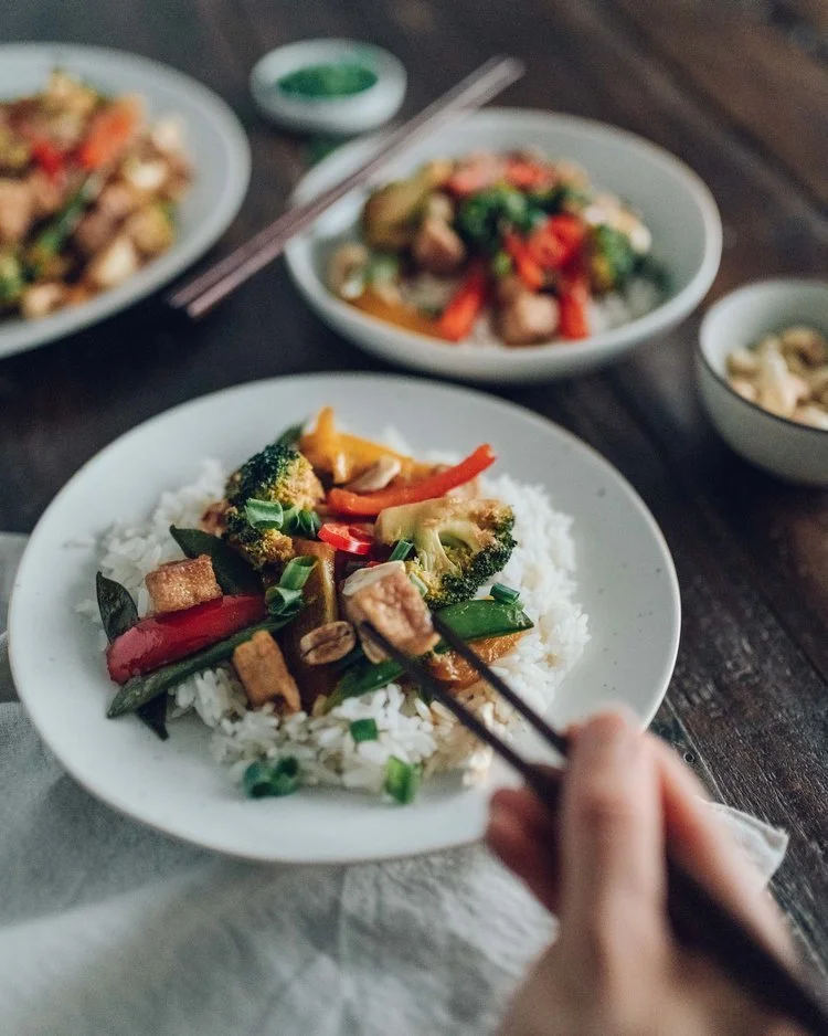 Tähän kiinalaiseen tofuun käytin yllä kuvailemaani menetelmää, eli ensin tofu paistetaan rapeaksi, jonka jälkeen se siirretään syrjään. Pilkotut kasvikset paistetaan pannulla, kunnes ne ovat melkein pehmenneet. Kastikkeen ainekset sekoitetaan kulhossa ja kaadetaan pannulle. Viimeisenä pannulle pääsee tofut. Tämä herkku tarjoillaan riisin tai nuudelin kera, ja viimeistellään kevätsipulilla, chilillä ja paahdetuilla cashewpähkinöillä.