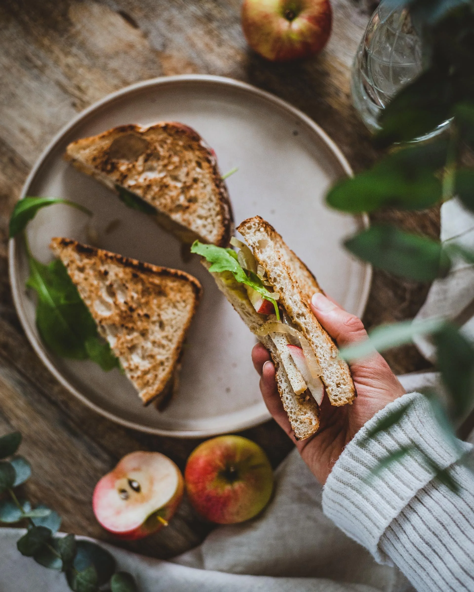 Voitele toinen puoli leivästä cheddar tuorejuustolla ja toinen dijon sinapilla. Täytä omenasiivuilla, tofulla, karamellisoidulla sipulilla ja rucolalla. Nauti!