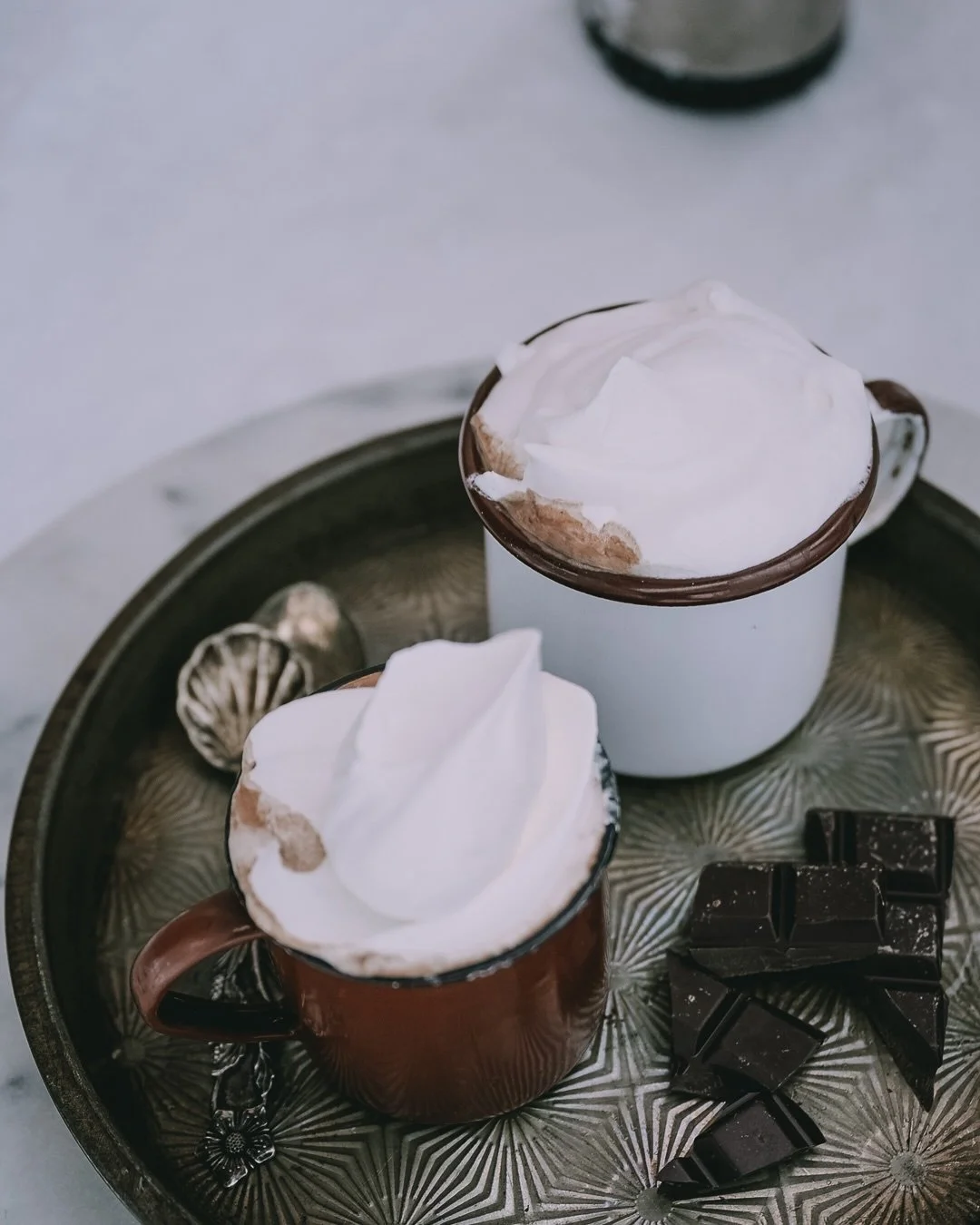 Vaahdota kasvivispi. Pakkaa mukaan rasiaan. Viimeistele kuuma juoma kermavaahdolla ja strösseleillä. Nauti!